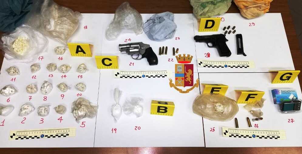 I poliziotti hanno concentrato la loro attenzione in tre diversi punti di un fabbricato (all’interno di un vano ricavato nel batti piedi di uno scalino tra il secondo ed il terzo piano, in alcune intercapedini ricavate all’interno del vano ascensore, nonché all’interno di un grosso vaso/fioriera dove c’era una pianta ornamentale) dove hanno trovato, abilmente occultati, circa 312 grammi di cocaina, un bilancino di precisione, della sostanza di colore bianco non reattiva ai test colorimetrici, verosimilmente utilizzato per il taglio della droga ed anche due pistole con relativo munizionamento.