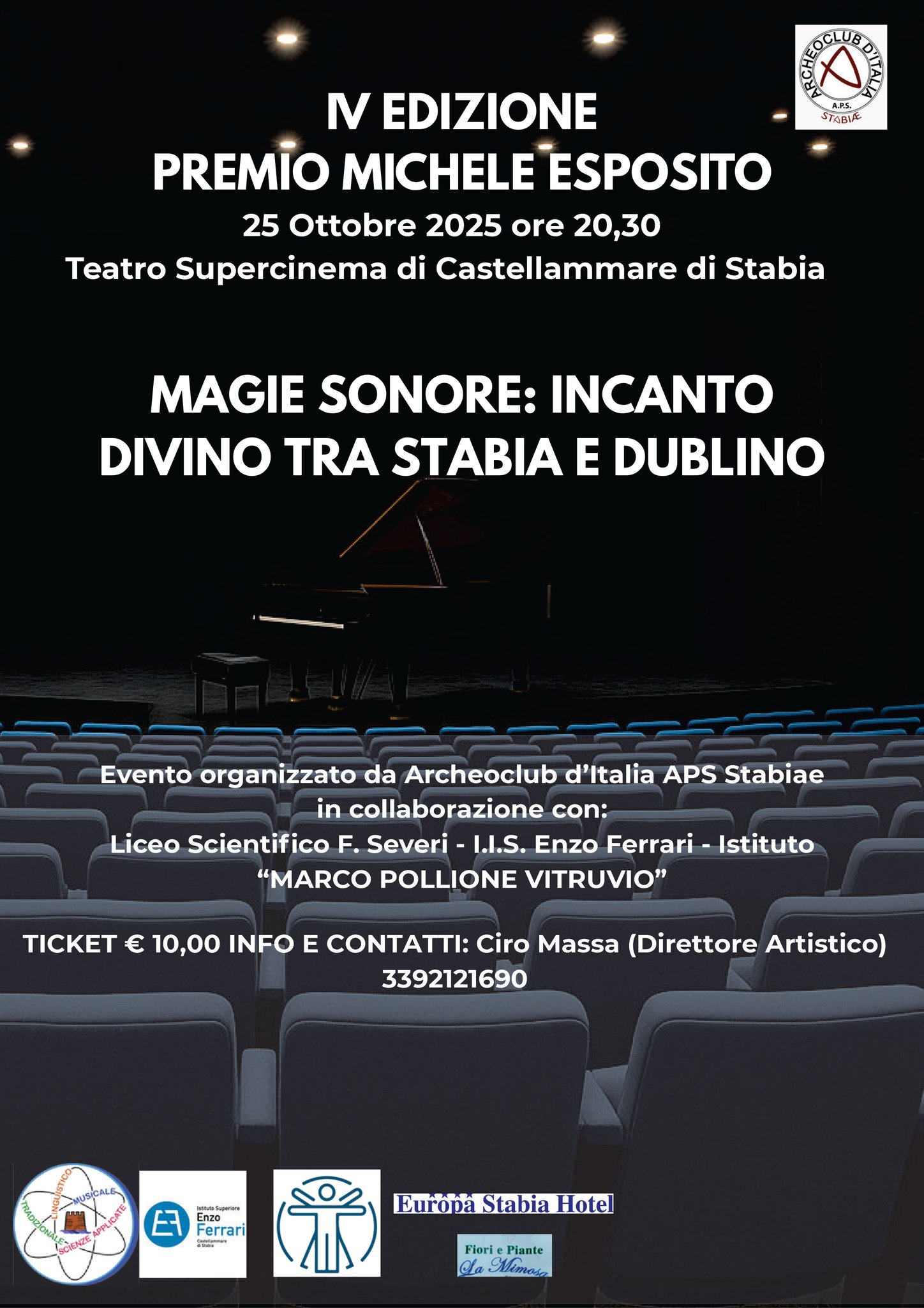 Il concerto, organizzato da Archeoclub d’Italia APS Stabiae in collaborazione con il Liceo Scientifico “F. Severi”, l’IIS Enzo Ferrari e l’Istituto Marco Pollione Vitruvio, vedrà protagoniste Raphaela Mangan (mezzosoprano) e Annalisa Monticelli (pianista). La direzione artistica è affidata a Ciro Massa, che da anni cura l’iniziativa con l’obiettivo di riscoprire e valorizzare la figura del compositore stabiese Michele Esposito.