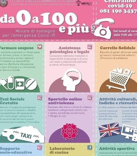 L’amministrazione comunale ha promosso il progetto “Da zero a cento e più”, una rete di interventi e servizi gratuiti rivolti a persone di tutte le età, con un’attenzione particolare alle famiglie in condizioni di disagio e non, ai minori, ai diversamente abili, agli anziani e non autosufficienti. L’obiettivo principale è soddisfare in maniera capillare le esigenze della popolazione e supportare adeguatamente i cittadini, ma anche intrattenere l’utenza con attività ludico-creative in modalità online che possano stimolare la socializzazione in un periodo di forte isolamento come quello che stiamo vivendo. Il progetto è stato inserito nella campagna social #TiComunico lanciata dall’Anci (Associazione nazionale Comuni Italiani) nata per raccontare i servizi attivi delle amministrazioni locali, le misure in campo a sostegno dei più fragili e le iniziative di inclusione sociale. Si tratta di un impegno quotidiano per fronteggiare l’emergenza sanitaria e socio- economica senza mai lasciare nessuno indietro. Il servizio, disposto dal lunedì al venerdì dalle ore 9:00 alle 17:00, prevede: l’acquisto di farmaci, l’assistenza psicologica e legale, il carrello solidale, servizio di trasporto per anziani e disabili, sportello antiviolenza, attività ludiche e ricreative, supporto socioeducativo, laboratorio di cucina e attività sportive.