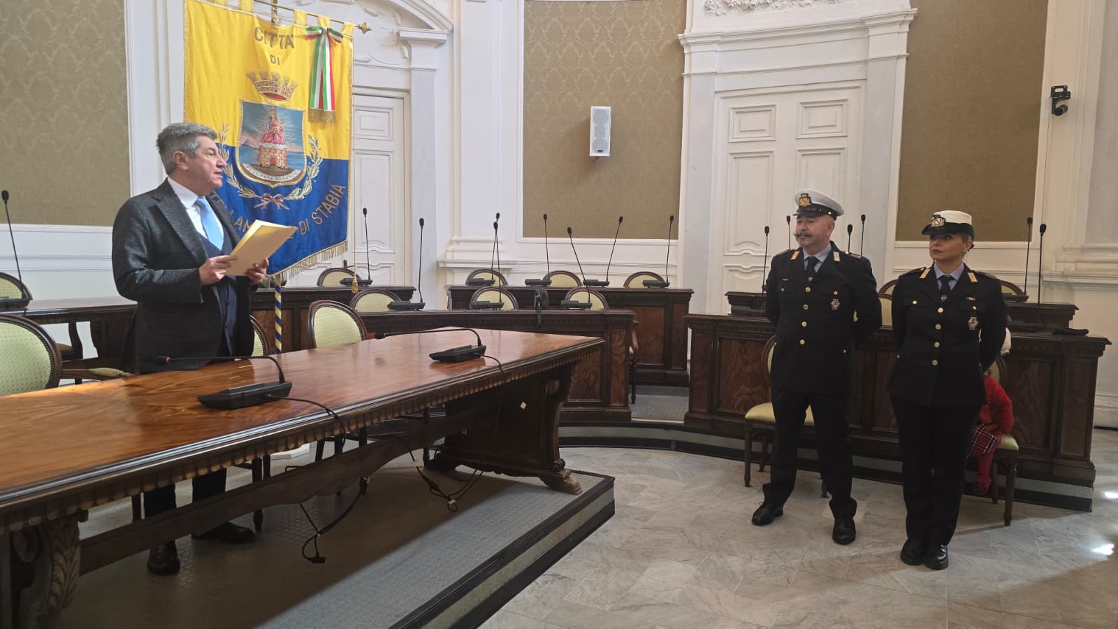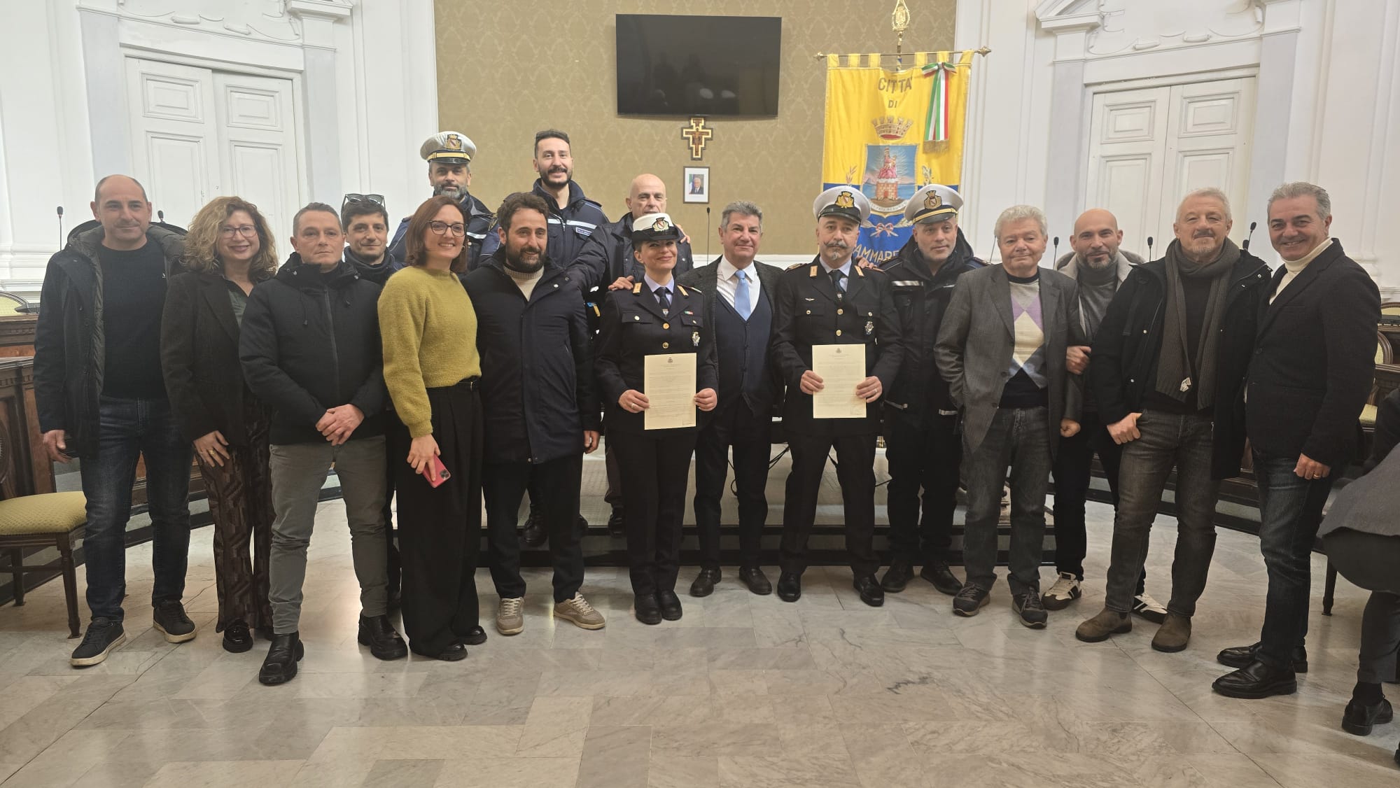 Encomio. Il Sindaco Luigi Vicinanza ha conferito un encomio al Maresciallo Nicola Coraggio e all’Assistente Ivana Cimmino, entrambi in servizio presso la Polizia Municipale, per il senso del dovere e l’alto spirito civico dimostrati lo scorso 22 dicembre. I due agenti, sebbene liberi dal servizio, sono intervenuti in via Napoli bloccando e identificando un uomo che, a bordo di un motocarro Piaggio Porter, stava trasportando oltre due metri cubi di rifiuti speciali con l’intento di abbandonarli illecitamente.