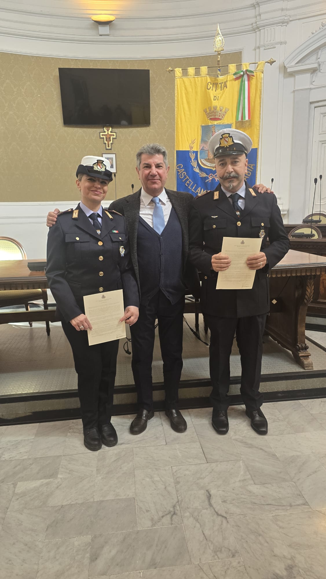 Encomio. Il Sindaco Luigi Vicinanza ha conferito un encomio al Maresciallo Nicola Coraggio e all’Assistente Ivana Cimmino, entrambi in servizio presso la Polizia Municipale, per il senso del dovere e l’alto spirito civico dimostrati lo scorso 22 dicembre. I due agenti, sebbene liberi dal servizio, sono intervenuti in via Napoli bloccando e identificando un uomo che, a bordo di un motocarro Piaggio Porter, stava trasportando oltre due metri cubi di rifiuti speciali con l’intento di abbandonarli illecitamente.