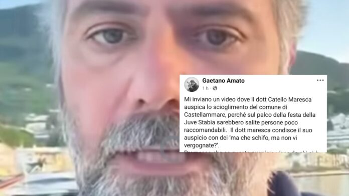 “Mi inviano un video dove il dott. Catello Maresca auspica lo scioglimento del comune di Castellammare, perché sul palco della festa della Juve Stabia sarebbero salite persone poco raccomandabili. Il dott. Maresca condisce il suo auspicio con dei ‘ma che schifo, ma non vi vergognate?’.