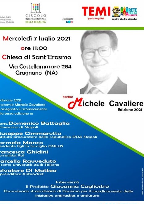 Il Premio Michele Cavaliere torna il 7 luglio 2021. L’ormai tradizionale cerimonia di consegna dei riconoscimenti alle personalità che si sono contraddistinte per il loro impegno a favore della giustizia e della legalità, giunta alla terza edizione, sarà ospitata quest’anno dalla Chiesa di Sant’Erasmo a Gragnano. Il Premio, organizzato dal Circolo della Legalità e da Sos Impresa, è dedicato all’imprenditore di Gragnano, Michele Cavaliere, ucciso tragicamente dalla camorra per aver deciso di denunciare i suoi estorsori.