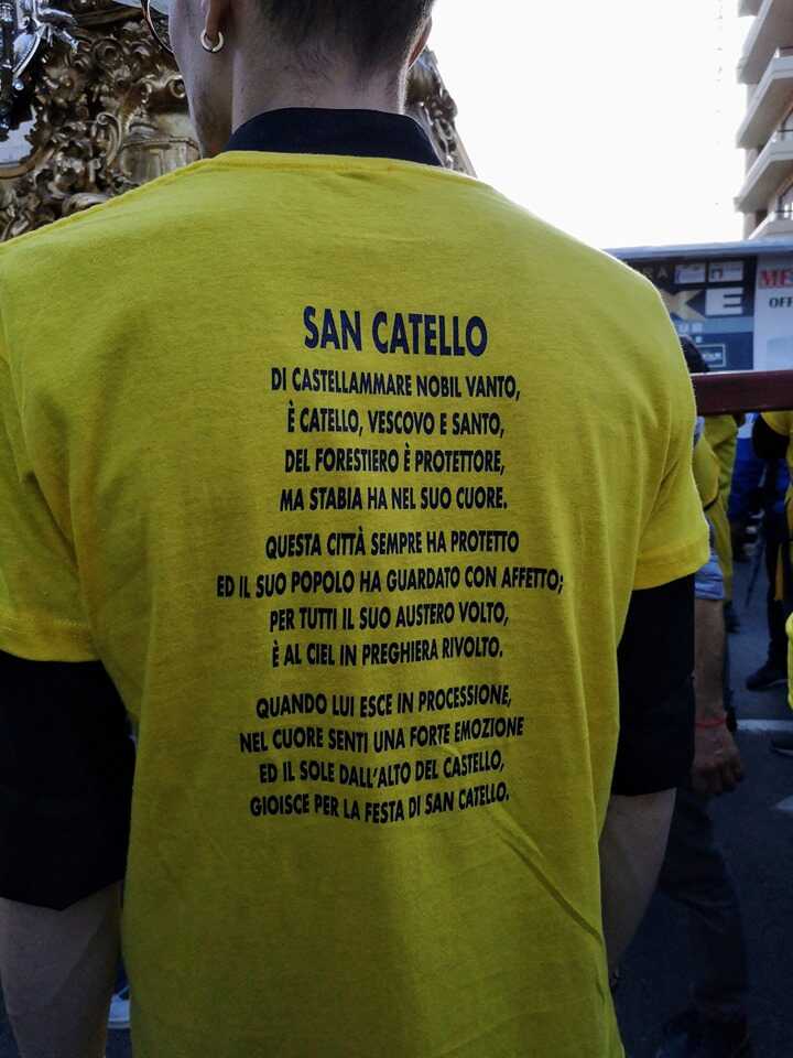 Anche quest’anno i portatori di San Catello hanno indossato la maglietta con la poesia di Bonuccio Gatti.Sulla vita di Catello si sa davvero molto poco. Vescovo di Castellammare di Stabia, visse all’epoca dell’invasione longobarda, tra il VI e i VII secolo. Si sa che ebbe una vita molto sofferta: sul monte Faito dove spesso si rifugiava in preghiera insieme a sant’Antonino, gli apparve in sogno l’arcangelo Michele e a ricordo dell’apparizione costruì un piccolo tempio, oggi totalmente ricostruito, conosciuto come santuario di San Michele Arcangelo al Monte Faito. Colpito da calunnie da suoi “familiari” (forse si intende vescovi di diocesi vicine), fu portato per un breve periodo a Roma, finché papa Gregorio I, a cui aveva predetto il pontificato, gli riaffidò la diocesi di Stabia: tornò trionfante in città, accolto dall’amico Antonino, poi divenuto abate in Sorrento. Grandissima partecipazione questo pomeriggio per la seconda processione dell’anno del patrono della città.. La statua di San Catello è stata portata in corteo lungo le strade del Centro Antico, con le tradizionali tappe presso le cappelle della città. La manifestazione religiosa si è svolta alla presenza del Sindaco di Castellammare Gaetano Cimmino e le autorità civili e religiose della città.