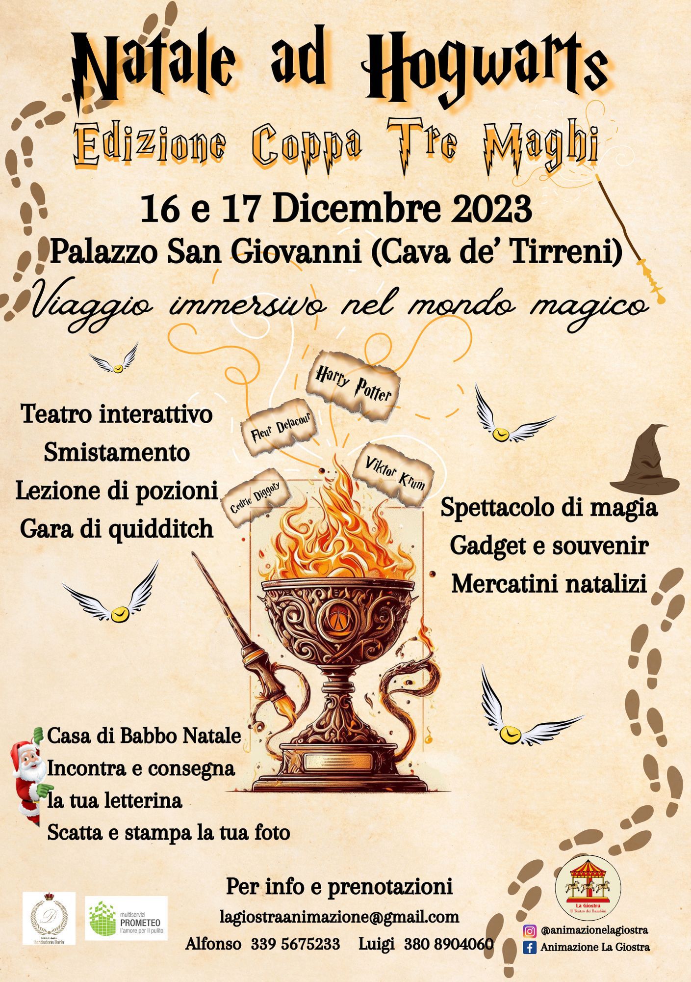 A spiegarlo è Alfonso D’Amato, presidente dell’associazione La Giostra e organizzatore dell’iniziativa, « “Un Natale ad Hogwarts – Edizione Coppa Tremaghi” – spiega D’Amato – è un viaggio immersivo nel mondo magico di Harry Potter, in cui i bambini potranno vivere un’avventura per salvare il Natale insieme ai loro personaggi preferiti della saga. I partecipanti potranno scegliere tra 6 diverse fasce orarie in entrambi i giorni, dalle 9 alle 20 il sabato e dalle 09 alle 20:30 la domenica. Il percorso ha la durata di un’ora e mezza e comprende uno spettacolo interattivo, un laboratorio creativo, uno spettacolo di magia, attività ludiche e molto altro…».