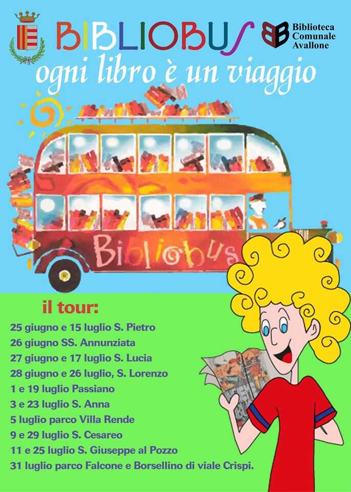Queste le tappe del BiblioBus: 25 giugno e 15 luglio S. Pietro; 26 giugno SS. Annunziata davanti l’oratorio; 27 giugno e 17 luglio S. Lucia (piazza Baldi/scuola primaria); 28 giugno e 26 luglio, S. Lorenzo, (spiazzo scuola primaria Carducci Trezza); 1 e 19 luglio Passiano (spiazzo chiesa SS. Salvatore); 3 e 23 luglio S. Anna (piazza B. Lamberti spiazzo scuola primaria); 5 luglio parco Villa Rende, ai Pianesi; 9 e 29 luglio S. Cesareo (spiazzo oratorio); 11 e 25 luglio S. Giuseppe al Pozzo (spiazzo scuola primaria); 31 luglio parco Falcone e Borsellino di viale Crispi.