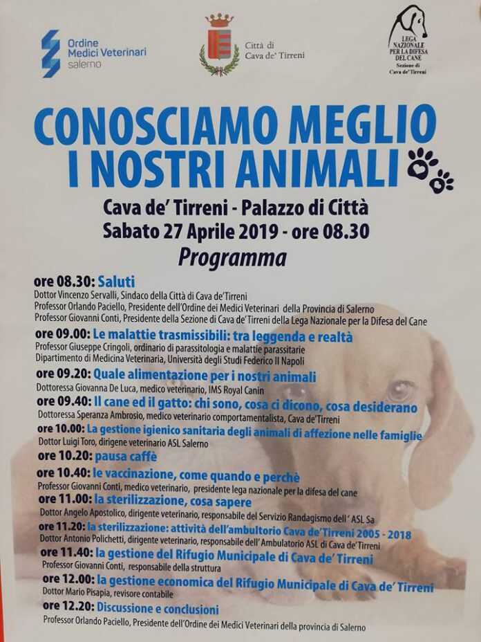 E’ il titolo del convegno organizzato dall’Ordine dei Medici Veterinari di Salerno, dalla Lega Nazionale per la Difesa del Cane, sezione Cava de’Tirreni, con il patrocinio del Comune e che si terrà sabato 27 aprile, alle ore 8.30, a Palazzo di Città. Dopo i saluti del Sindaco Vincenzo Servalli, del Presidente dell’Ordine dei Medici Veterinari della Provincia di Salerno, Orlando Paciello e del Presidente della sezione di Cava de’Tirreni della Lega Nazionale per la Difesa del Cane, Giovanni Conti, sono previsti gli interventi del Professore Giuseppe Cringoli sul tema delle malattie trasmissibili: tra leggenda e realtà; delle dottoresse Giovanna De Luca e Speranza Ambrosio sul tema dell’alimentazione e sul comportamento sul linguaggio e sui desideri dei nostri animali; dei dottori Luigi Toro, Giovanni Conti, Angelo Apostolico, Antonio Polichetti e Mario Pisapia. Le conclusioni sono affidate al Professor Orlando Paciello.