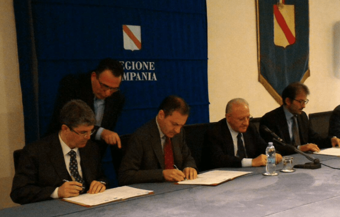 Firmato a Napoli l’accordo per la riprogrammazione dei fondi Più Europa, che assegnano a Cava de’ Tirreni (unica città del salernitano) circa 14 milioni. Presenti il sindaco Vincenzo Servalli ed il governatore Vincenzo De Luca. Durante l’incontro si è parlato anche dell’ospedale cavese. De Luca ha espresso un giudizio negativo sul piano di riassetto deciso dal manager Vincenzo Viggiani ed ha espresso la volontà di fare quanto possibile per la salvaguardia dei livelli di assistenza del Santa Maria Incoronata dell’Olmo. La firma dell’accordo prevede oltre al completamento dei cantieri aperti e non completati alla data del 31 dicembre, anche il finanziamento di due nuovi interventi: la riqualificazione dell’intera area antistante il complesso di San Giovanni con l’abbattimento della palestra Parisi di via Nigro e la riqualificazione dell’area esterna del Palaeventi “cosiddetto palazzetto dello sport.
