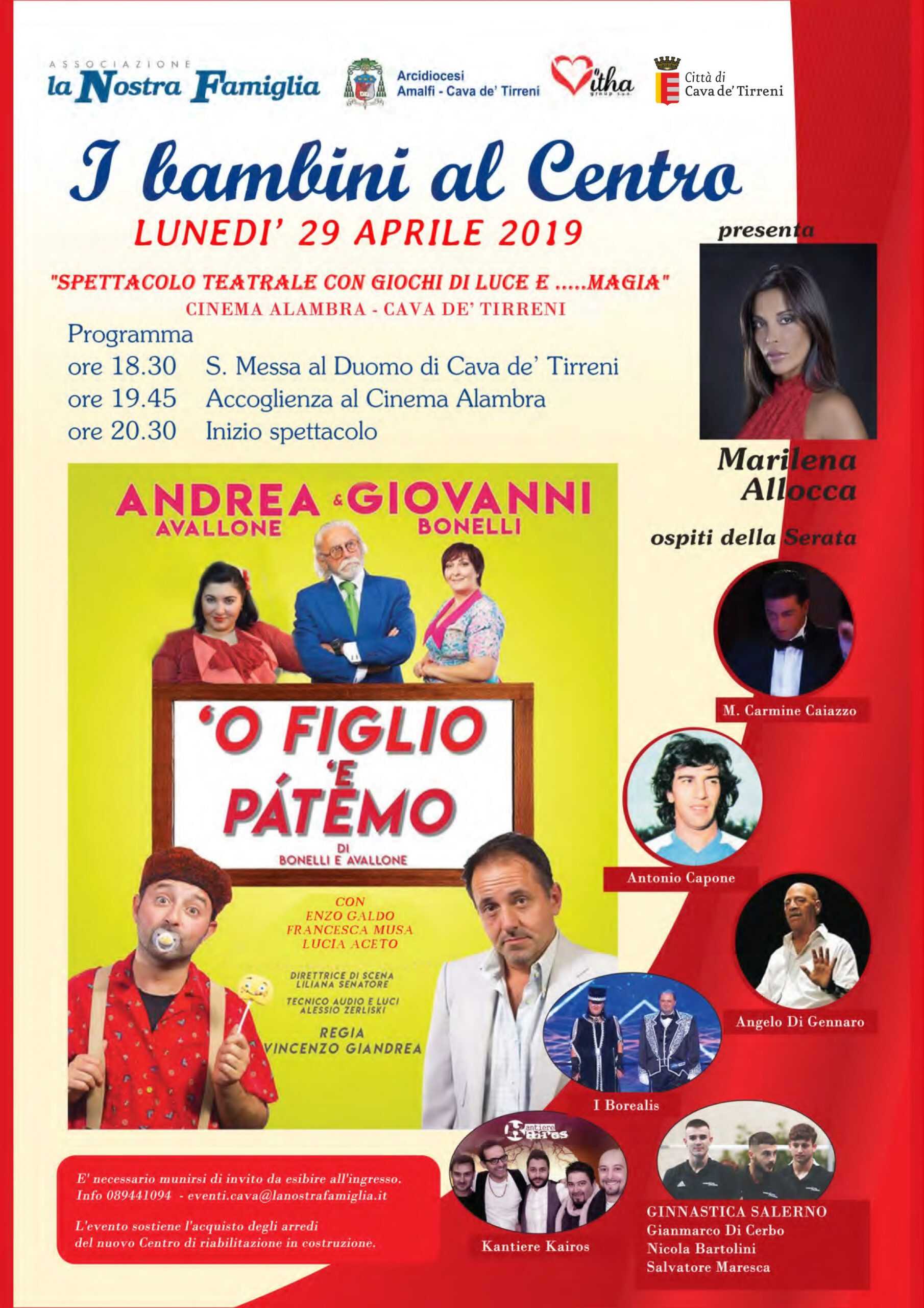 spettacolo comico dal titolo “ ‘O figlio ‘e pàtemo” di Giovanni Bonelli e Andrea Avallone. Con la partecipazione di Enzo Galbo, Francesca Musa, Lucia Aceto. Direttrice di scena è Liliana Senatore, il tecnico audio e luci è Alessio Zerliski, la regia è di Vincenzo Giandrea. A presentare la serata sarà l’attrice Marilena Allocca. Numerosi gli ospiti che saranno presenti alla serata tra cui il cabarettista Angelo Di Gennaro, “I Borealis” con il loro spettacolo di luci e magia, il musicista Carmine Caiazzo, l’ex-calciatore Antonio Capone, la Rock Band cristiana “Kantiere Kairos” e gli atleti della Ginnastica Salerno Gianmarco Di Cerbo, Nicola Bartolini e Salvatore Maresca che parteciperanno alle olimpiadi di Tokyo 2020.