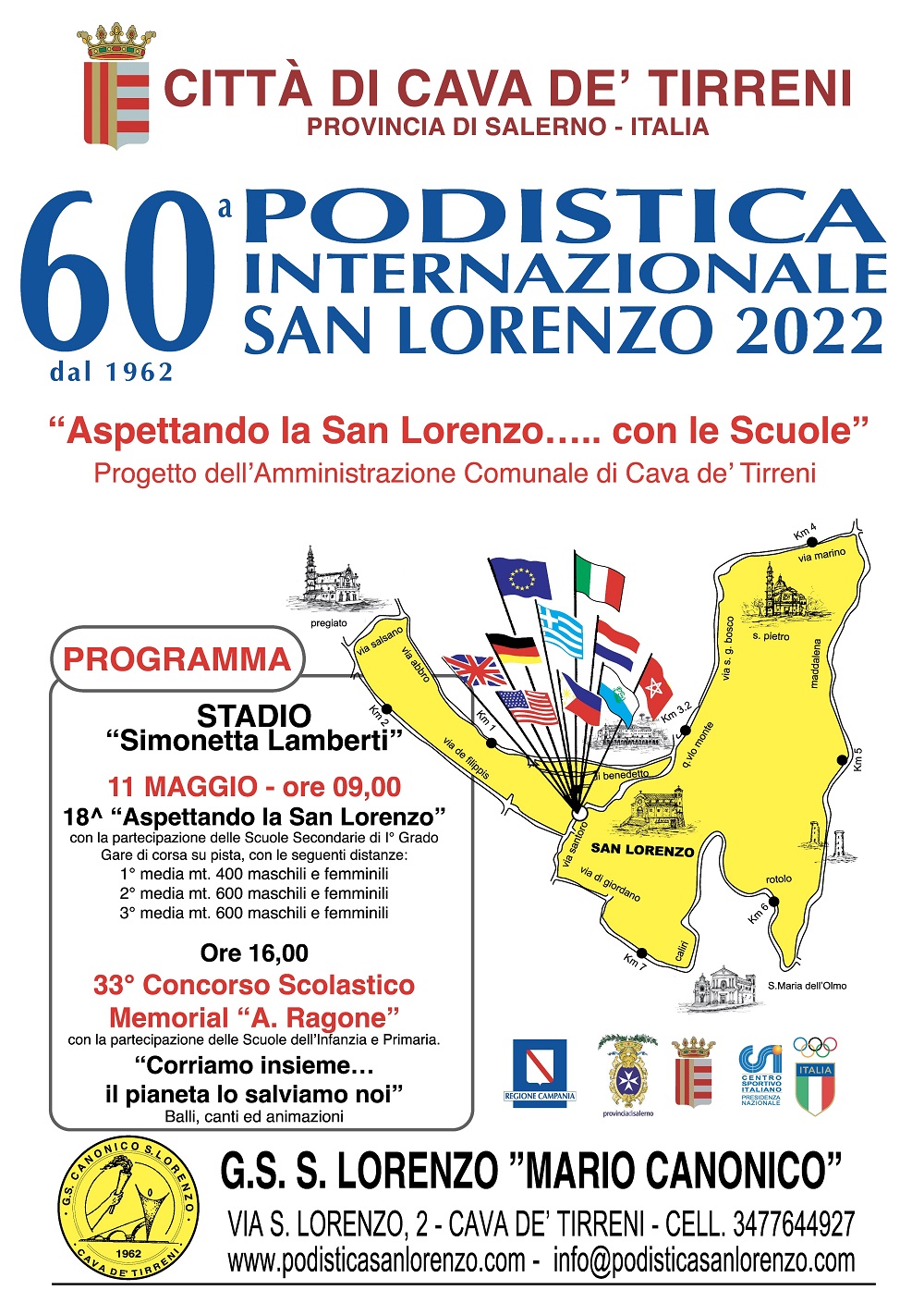 Ritorna la festa giovanile della “Podistica Internazionale San Lorenzo”. Dopo due anni di stop forzato a causa del Covid, mercoledì 11 maggio 2022 saranno circa 800 i bambini e ragazzi che con il loro entusiasmo animeranno a Cava de’ Tirreni (SA) la manifestazione “Aspettando la San Lorenzo… con le Scuole 2022”, un progetto fortemente voluto dall’Amministrazione comunale metelliana ed organizzato dal Gruppo Sportivo “Mario Canonico S. Lorenzo”, in collaborazione con il Centro Sportivo Italiano di Cava de’ Tirreni.