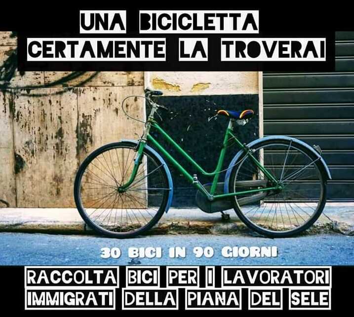 “Una bicicletta certamente la troverai”. E’ questo il motto del progetto “Raccolta bici per i lavoratori immigrati della Piana del Sele”, ideato da Pippo Zarrella, membro dell’associazione “Eugenio Rossetto” di Cava de’ Tirreni.