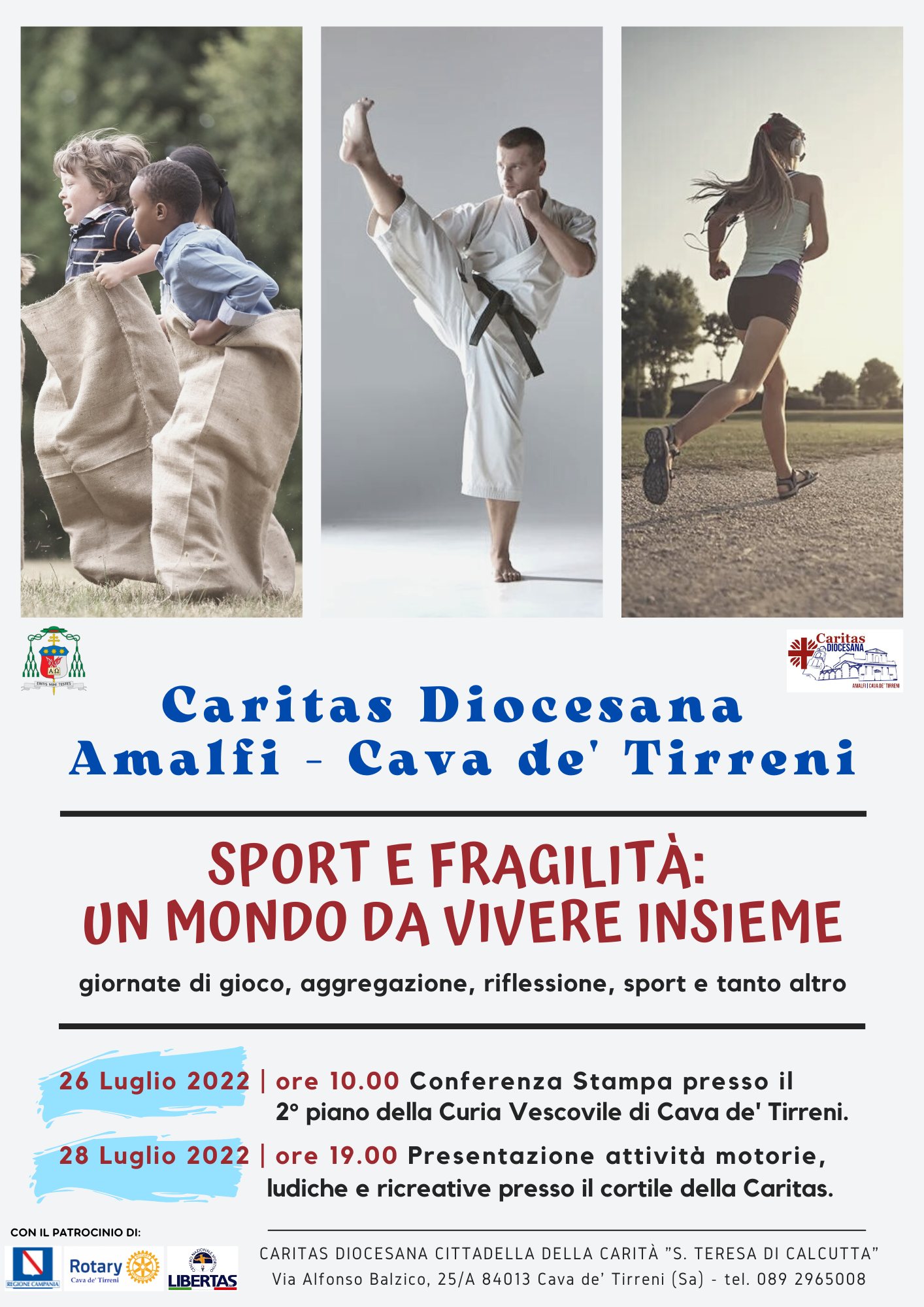 Il progetto che nasce dalla collaborazione tra la Caritas Diocesana Amalfi Cava ed il centro Regionale Sportivo LIBERTAS Campania, intende promuovere sul territorio della città di Cava dè Tirreni l’attività sportiva per le famiglie che non possono sostenere tali costi, facilitando così il processo di crescita dei ragazzi, con particolare attenzione all’inclusione sociale.