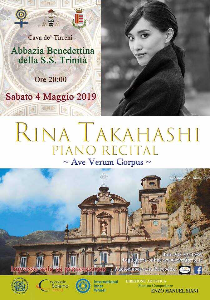 Sabato 4 maggio 2019, dalle ore 20:00 alle 21:00, nell’Abbazia Benedettina della Santissima Trinità, si terrà il grande concerto di Rina Takahashi – Piano Recital – Ave Verum Corpus. Direzione artistica del pianista compositore Enzo Manuel Siani.