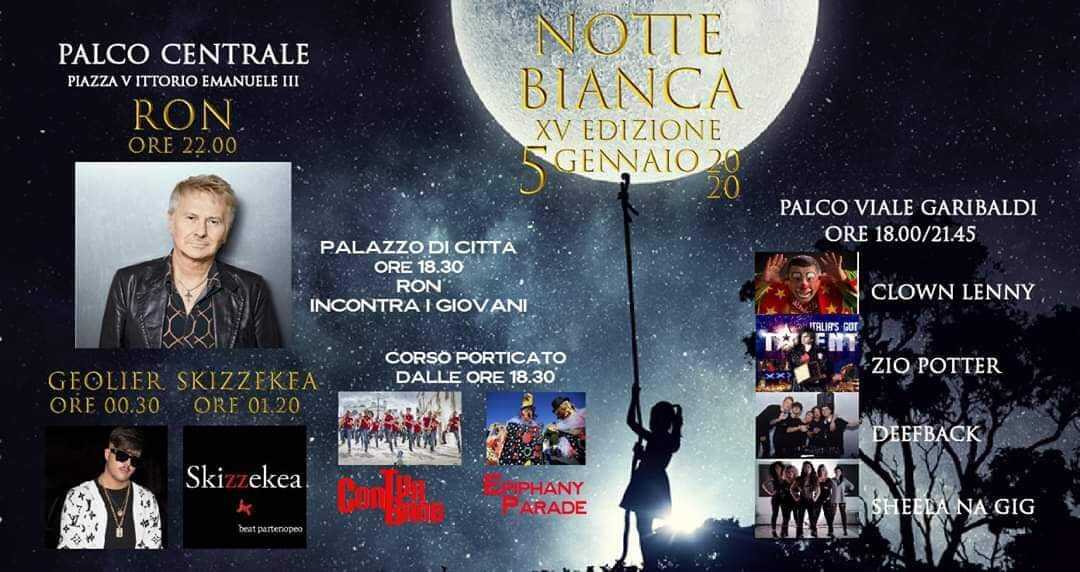 Lungo il centro storico porticato, invece, partiranno alle ore 18.30 le spettacolari esibizioni dell’allegra brigata della Compagnia degli Sbuffi con la “Epiphany Parade”, trampolieri, befane giganti, pupazzoni e caramelle per i bambini, che da viale Garibaldi arriverà in piazza San Francesco, mentre da piazza San Francesco partirà la spettacolare musica in movimento della “Conturband”, quindici musicisti che si esibiscono sullo stile delle street band americane di New Orleans. Alle ore 18.30, intanto, il grande cantautore italiano RON incontrerà i giovani nell’Aula Consiliare di Palazzo di Città. Il giornalista Antonio Di Giovanni condurrà l’incontro con Rosalino Cellamare che racconterà la sua straordinaria vita, gli incontri con i più grandi artisti italiani e soprattutto con Lucio Dalla, e risponderà alle domande dei ragazzi. Alle 21.30, i presentatori Manuela Pannullo e Alfonso Senatore sul palco centrale di piazza Vittorio Emanuele III, accenderanno la Notte Bianca con i saluti del Sindaco Vincenzo Servalli e il Concerto di RON che inizierà alle 22.00. Alle 00.30 di lunedì 6 gennaio, aprirà il giorno della befana il rapper napoletano del momento, Emanuele Palumbo, in arte “Geolier”, uno dei nomi più importanti dell’attuale scena rap napoletana. Classe 2000, divenuto famoso nel 2018 grazie al successo di P Secondigliano, brano divenuto virale sul web, è letteralmente esploso nel 2019 con la pubblicazione l’11 ottobre del suo album di esordio, Emanuele.