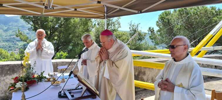 Festeggiamenti in onore del Santissimo Sacramento 1656/2020, al tempo del covid-19. Celebrata stamattina, sulla terrazza inferiore del Castello di Sant’Adiutore, nelle modalità previste dalle norme anti diffusione del contagio e con un numero contingentato di partecipanti, la Santa Messa officiata da S.E. Mons. Orazio Soricelli, alla presenza del Sindaco Vincenzo Servalli, del Presidente dell’Ente Montecastello, Mario Sparano, del vice Sindaco Armando Lamberti, dell’Assessore Nunzio Senatore e di tutti i rappresentanti delle Associazioni e Casali dei Trombonieri, e delle Associazioni degli Sbandieratori.
