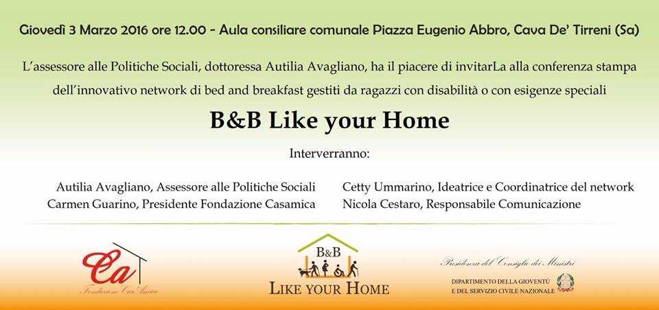 Giovedì 3 marzo, alle ore 12.00, nell’Aula Consiliare di Palazzo di Città, l’assessore alle Politiche Sociali, dottoressa Autilia Avagliano, ha il piacere di invitare i cittadini alla conferenza stampa dell’innovativo network di bed and breakfast gestito da ragazzi con disabilità o con esigenze speciali “B&B Like your Home”. Interverranno: Autilia Avagliano, Assessore alle Politiche Sociali; Carmen Guarino, Presidente Fondazione Casamica; Cetty Ummarino, Ideatrice e Coordinatrice del network; Nicola Cestaro, Responsabile Comunicazione.