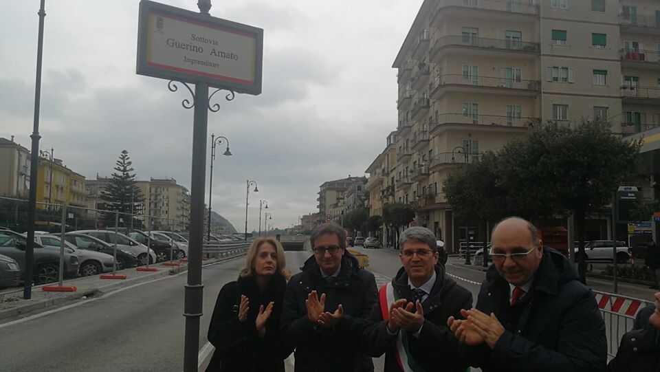 I figli Franco e Giovanna ed il Sindaco Vincenzo Servalli hanno scoperto la targa dell’intitolazione del nuovo sottovia a Guerino Amato, a dieci anni dalla scomparsa dell’imprenditore e del Presidente della Cavese per antonomasia, della Serie B e della storica vittoria 2-1 allo stadio San Siro contro il Milan.