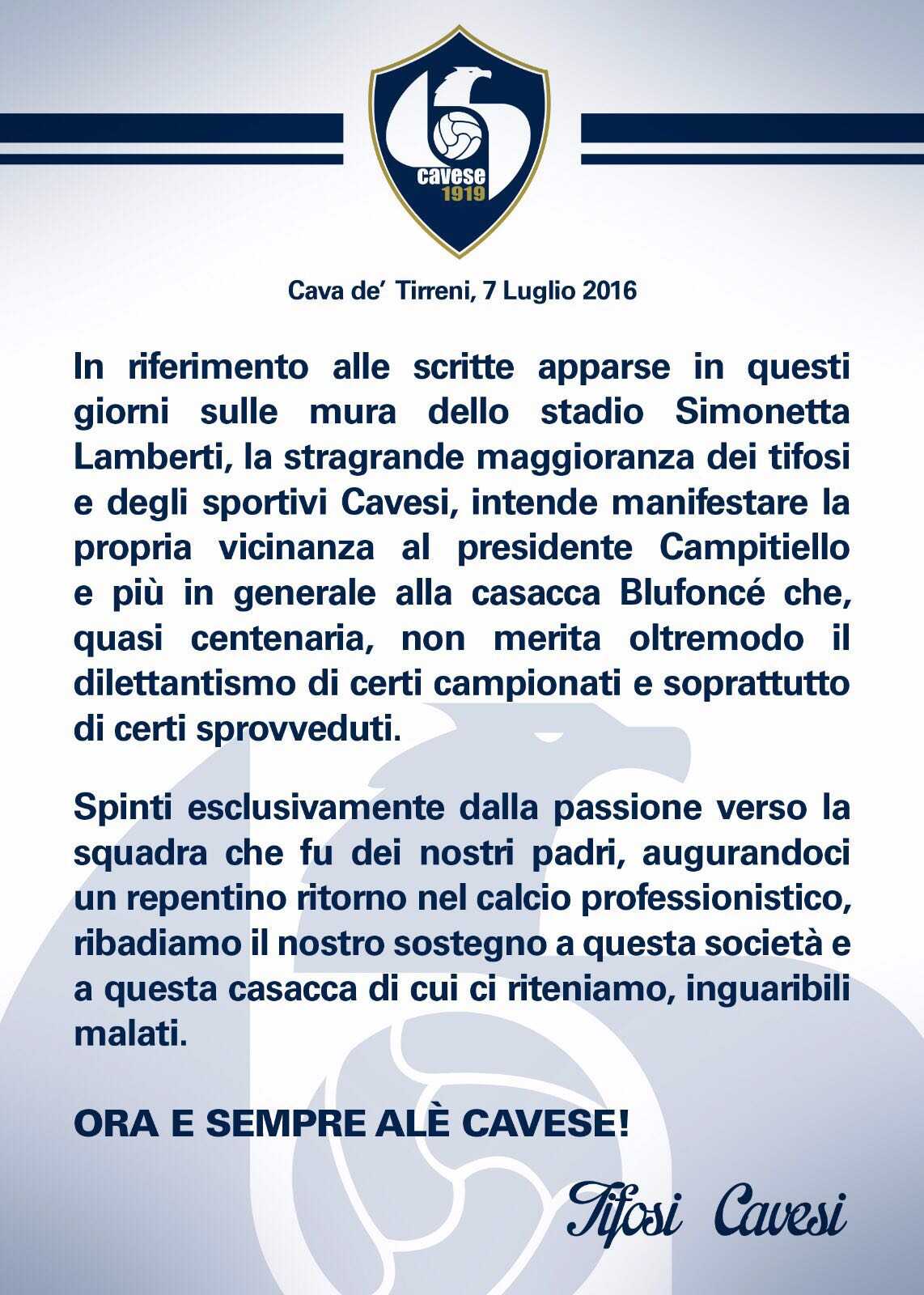 Il messaggio è firmato “Tifosi Cavesi” e prosegue in maniera decisa: «Spinti esclusivamente dalla passione che fu dei nostri padri, augurandoci un repentino ritorno nel calcio professionistico, ribadiamo il nostro sostegno a questa società e a questa casacca di cui ci riteniamo inguaribili malati».