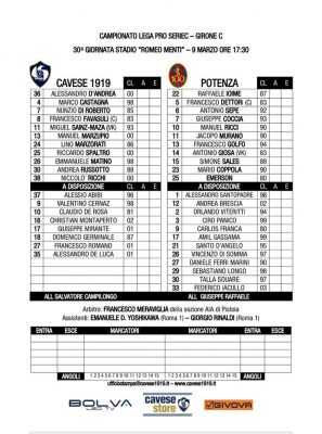 Tra i pali c’è l’ultima defezione di giornata: febbre per Bisogno, al suo posto va D’Andrea. A comporre la difesa Matino, Marzupio e Marzorati mentre Spaltro e Ricchi agiscono come esterni di centrocampo. Davanti fantasia con Di Roberto e Sainz Maza ai lati di un Russotto finto centravanti. Terzo minuto, rande iniziativa personale di Russotto che arriva ai venti metri e calcia col sinistro. Ioime è battuto ma il legno dice ‘no’. Marzorati rischia tantissimo con un retropassaggio per D’Andrea sul quale si è inserito Golfo ma l’estremo difensore dei padroni di casa si salva in qualche modo. Occasione per il Potenza con la conclusione dal limite del difensore ospite Giosa ma è bravo D’Andrea a respingere. Poi Murano manca il tap-in ma è in offside. Secondo tempo,  seconda grande occasione per la Cavese allo stesso minuto del palo di Russotto nel primo tempo. Ma questa volta Sainz Maza se l’è clamorosamente mangiato a porta vuota, colpendo il palo dopo aver saltato il portiere. Grandissima parata di D’Andrea su un colpo di testa diretto all’incrocio dei pali da parte di Murano. Lo stesso D’Andrea, qualche minuto dopo, sbaglia tutto in fase di uscita e regala il pallone a Golfo ma il cross del numero 13 viene deviato in corner. Fuori Sainz Maza, dentro Germinale.Occasione ancora per Murano, che impatta con il piattone in area di rigore sul cross di Golfo ma manda alto. Fuori Ricchi, dentro De Luca. A tre minuti, ancora applausi per D’Andrea, parata strepitosa del portiere della Cavese che neutralizza un rigore in movimento calciato da Ricci. Incredibile occasione sprecata dal Potenza con il centrocampista D’Angelo che si inserisce con i tempi giusti e da posizione centrale calcia incredibilmente a lato. Allo scadere, fuori Di Roberto, dentro Romano. Esordio per il difensore classe 2001. Intanto, attraverso una nota ufficiale, la Cavese rende noto di aver trovato l’accordo con Giuseppe Pavone fino al 2023. Continua quindi congiuntamente il lavoro tra le parti, iniziato due stagioni fa con l’ex capitano biancoblu che oggi ricopre il ruolo di DG Area Tecnica del club.