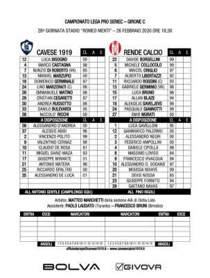Formazione metelliana di partenza, Di Roberto e Russotto esterni di centrocampo e il tandem d’attacco formato da Germinale e Cesaretti. A centrocampo è ancora una volta Bulevardi a prevalere su Matera. Confermata la difesa vista all’opera contro il Bari. A sorpresa la sbloccano gli ospiti con il capitano che si inserisce con i tempi giusti sul cross di Origlio e batte Bisogno sottoporta. Prima chance per la Cavese con un calcio piazzato di Russotto dai 25 metri con Borsellini attento e bravo a respingere con i pugni. Azione insistita dei padroni di casa con Russotto che dalla sinistra mette un cross delizioso per il numero 18 che si gira alla perfezione in area di rigore e batte Borsellini. Pericolosa la squadra di Rigoli con Saveljevs, che va alla conclusione ma viene murata da Marzorati in angolo. Cross invitante di Ricchi dalla sinistra per l’inserimento di Matino, che di testa impegna Borsellini. Prima frazione di gioco a fiammate: alla prima occasione è passato in vantaggio il Rende con Rossini al 18′. bravo nell’inserimento e nel tocco sottoporta. Al 30′ è arrivato il pari di Germinale, al termine di un’azione insistita di Russotto.
