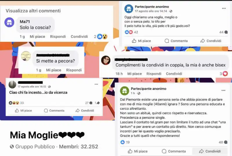 Il gruppo Facebook “Mia moglie”, con oltre 32.000 iscritti, è finito nel mirino della Polizia postale dopo l’escalation di denunce da parte delle vittime — donne che, senza alcun preavviso, si sono trovate esposte al pubblico come oggetti . “Mi sono sentita sbagliata, spezzata in due”, racconta una delle donne denunciate, mentre un’altra confida la sorpresa devastante (“Come può essere un gioco?”) nello scoprire un tradimento intimo trasformato in esibizione crudele .