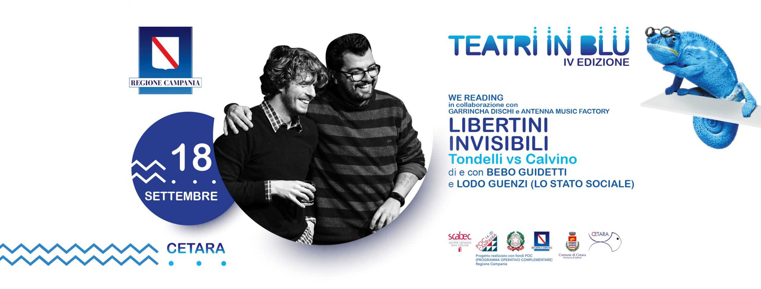Venerdì 18 settembre, prosegue Teatri in Blu, la rassegna di teatro e musica ideata da Vincenzo Albano per il borgo marinaro di Cetara, finanziata e promossa dalla Regione Campania attraverso la Scabec S.p.A., con “Tondelli Vs Calvino – Libertini Invisibili”, un doppio reading costruito sui testi di Pier Vittorio Tondelli e Italo Calvino, che vedrà protagonisti Lodovico “Lodo” Guenzi e Alberto “Bebo” Guidetti, rispettivamente, voce e beatmaker dello Stato Sociale (gruppo rivelazione nel 2018 al Festival di Sanremo), in scena in piazzetta Grotta alle ore 21.00.
