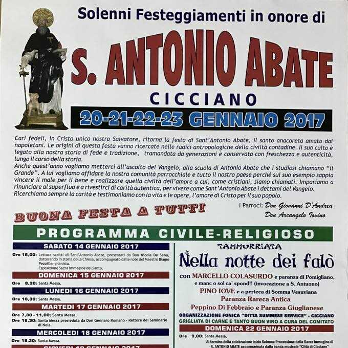 Si terranno dal 20 al 23 gennaio i solenni festeggiamenti in onore di Sant’Antonio Abate a Cicciano. Sante messe, balli e canti popolari, tammurriata, processioni e falò allieteranno i cittadini presenti all’evento in onore di un Santo venerato da oltre un secolo, protettore degli animali domestici, degli allevatori, dei contadini e di tutti coloro che hanno a che fare con il fuoco. Sabato 21 gennaio andrà in scena il tradizionale Falo di Sant’Antonio, con Marcello Colasurdo, Pino Iove, la paranza rareca antica e Peppino Di Febbraio e paranza Giuglianese, una grigliata di carne e tanto buon vino ad accompagnare la magica serata che si ripete ormai da oltre vent’anni.