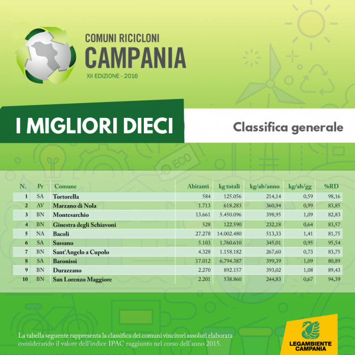 Tortorella, piccolo comune salernitano di 545 abitanti con 98,16% di RD e 96.71 indice IPAC è il “Comune Riciclone Campano” 2016. Al posto d’onore Marzano di Nola (Av) con l’83,85% di raccolta differenziata e 88,70 di indice IPAC; medaglia di bronzo per il comune beneventano di Montesarchio con il 82,83% RD e 87,98 di indice IPAC. È stata presentata la XII edizione del Premio Comuni Ricicloni Campania 2016 di Legambiente, il riconoscimento ai Comuni per la migliore qualità di raccolta differenziata. Sono definiti comuni ricicloni 2016 tutte quelle amministrazioni che hanno raggiunto la percentuale del 65% (come richiesto dalla normativa vigente), mentre per stabilire la classifica generale e la premiazione dei comuni è stato definito un metodo di valutazione, che tiene conto della percentuale di raccolta differenziata raggiunta dai comuni nel 2015 e della valutazione delle buone pratiche adottate dagli stessi. Dalla somma dei due indicatori è fatto derivare l’indice IPAC (Indice di prestazione ambientale del comune) che stabilisce la graduatoria finale. All’indagine hanno risposto ben 523 comuni pari al 95% del totale dei comuni (550), corrispondenti in termini di popolazione a circa il 99% del totale regionale. Per quanto riguarda la classifica dei capoluoghi di provincia la maglia rosa spetta a Benevento con 65,23% di raccolta differenziata, seguita da Salerno con il 64,05%. Terza Caserta con 47,84% e Avellino con 34%. Napoli chiude con 24,96%.