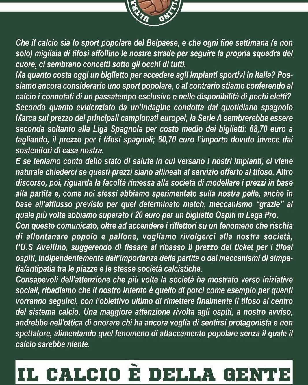 Proprio su questo punto è intervenuta la Curva Sud Avellino, che attraverso un manifesto ha voluto lanciare un messaggio forte e chiaro: “Il calcio è della gente”. Nel testo, i tifosi sottolineano come il calcio rischi di allontanarsi sempre più dal popolo, diventando un privilegio per pochi. “Che il calcio sia lo sport popolare del Belpaese è sotto gli occhi di tutti – si legge nel comunicato – ma quanto costa oggi seguire la propria squadra? Possiamo ancora definirlo uno sport popolare o sta diventando un lusso per pochi eletti?”.