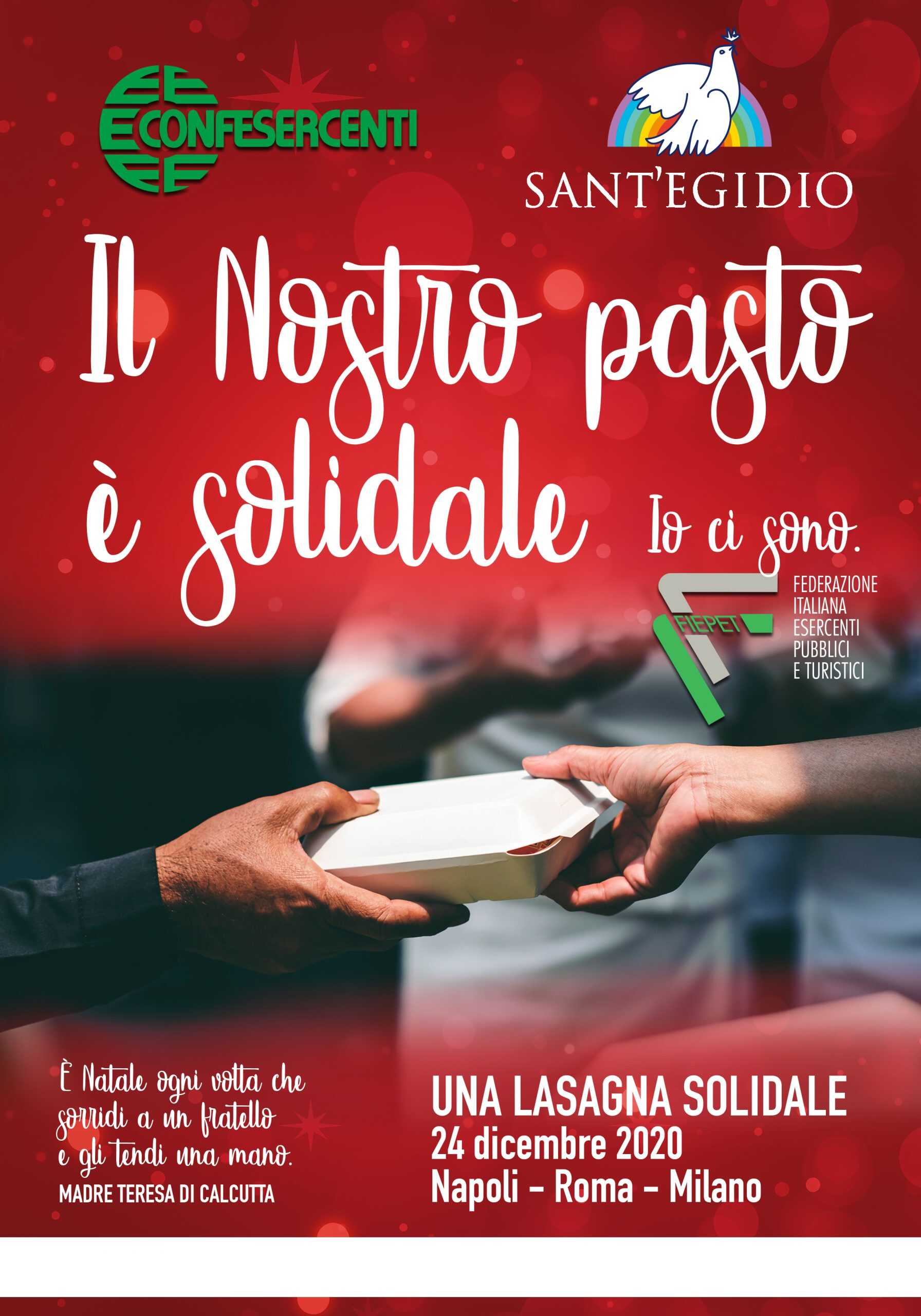 Dopo la “Pizza Solidale” del 28 novembre scorso, Confesercenti Campania lancia anche la “Lasagna Solidale”: domani, 24 dicembre, alla vigilia di Natale, i ristoratori di Napoli consegneranno a pranzo 1500 lasagne alla Comunità di Sant’Egidio per donarle ai poveri e ai bisognosi assistiti con amore dall’ente laico noto in tutto il mondo. Insieme al pasto saranno donate anche 60mila mascherine anti-Covid (un omaggio della azienda ESSECI Italia srl).