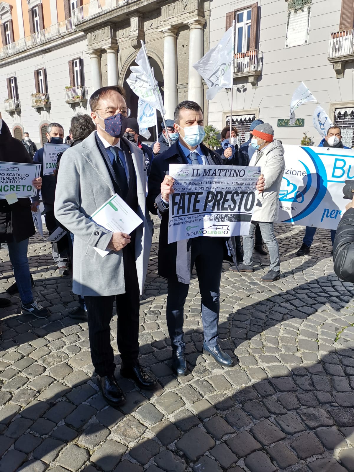 Si è tenuta questa mattina, dinanzi alla Prefettura di Napoli, la manifestazione di protesta delle aziende di noleggio auto e di autobus turistici, ignorati del tutto dal Governo Nazionale, fermi da oltre un anno a causa del Covid-19. Un sit in, organizzato da Confesercenti e Federnoleggio, in cui sono scesi in strada oltre cento persone, rappresentanti delle aziende di bus turistici ma anche dell’indotto (carrozzieri, meccanici, elettrauto, autisti ecc..).