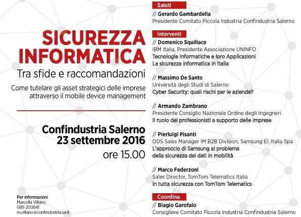 “Sicurezza informatica, tra sfide e raccomandazioni – Come tutelare gli asset strategici delle imprese attraverso il mobile device management” è il titolo del seminario che si terrà venerdì 23 settembre, alle ore 15.00, presso la sede di Confindustria Salerno. L’incontro è organizzato dal Comitato Piccola Industria di Confindustria Salerno in collaborazione con Samsung Electronics Italia Spa. Anche l’Università di Salerno prenderà parte al dibattito con un intervento sul tema “Cyber Security: quali rischi per le aziende’” (a cura del prof. Massimo De Santo del Dipartimento di Ingegneria Industriale/DIIN UNISA).