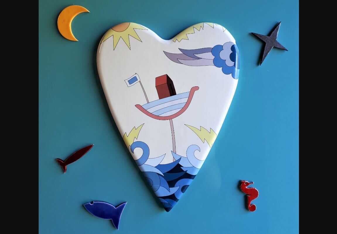 Le piccole sagome in ceramica dipinta a mano (stella, luna, pesci, cavalluccio marino) che circondano il cuore (carico di sogni ed emozioni), movimentano il cielo ed il mare, idealmente fusi nella brillante laccatura verde mare (tra il turchese e lo smeraldo) del fondo.