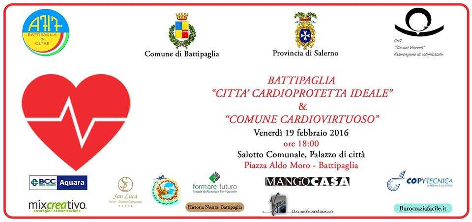 Le associazioni “A717 Battipaglia & Oltre” e “Gi.Vi. Giovani Vincenti” hanno organizzato il convegno “Battipaglia città cardioprotetta ideale e comune cardiovirtuoso” che si terrà il giorno 19 febbraio 2016 alle ore 18:00 presso il Salotto Comuale di Battipaglia.