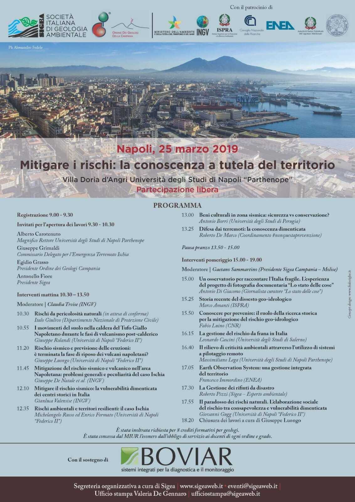 La Sigea e l’Ordine dei Geologi della Campania hanno organizzato in Napoli per il giorno 25 marzo 2019 il Convegno dal titolo “Mitigare i rischi: la conoscenza a tutela del territorio”; l’evento si svolgerà presso Villa Doria d’Angri Università degli Studi di Napoli “Parthenope”.