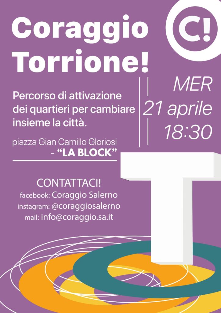 Mercoledì 21 aprile alle ore 18:30, in piazza Gian Camillo Gloriosi, conosciuta anche comunemente come "La Block", Coraggio Salerno! incontra i cittadini del quartiere di Torrione, ovviamente nel rispetto di tutte le norme di tutela della salute.