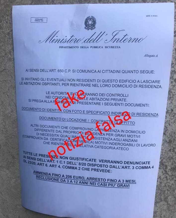 Sta girando questo falso avviso. Qualcuno lo ha postato come vero ma vi assicuriamo che così non è. Restate a casa che sia domicilio o residenza il principio è semplice bisogna evitare gli spostamenti. Restare a casa per interrompere la diffusione del virus questo è l’obiettivo. Se qualcuno si presenta a casa denunciate subito e non aprite.