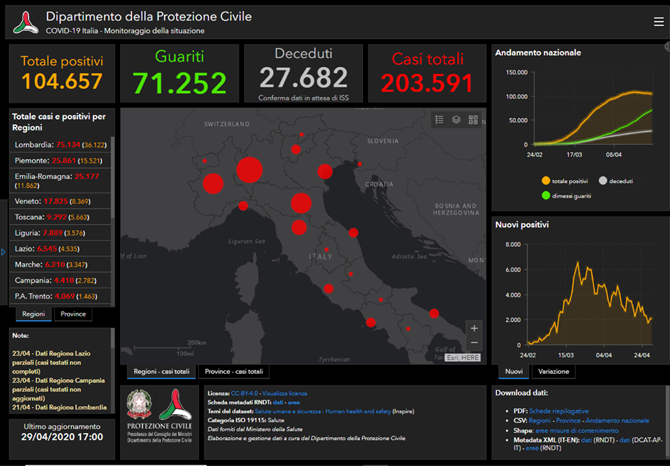 Totale positivi: 104.657. Dimessi e guariti: 71.252. Deceduti: 27.682. Casi totali: 203.591. ll totale delle persone che hanno contratto il virus è 203.591, con un incremento rispetto a ieri di 2.086 nuovi casi. Il numero totale di attualmente positivi è di 104.657, con una decrescita di 548 assistiti rispetto a ieri.