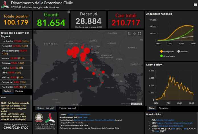 Nelle ultime 24 ore hanno perso la vita 174 persone, per un totale di 28.884 decessi dall’inizio dell’emergenza. Secondo i dati forniti dalla Protezione Civile sono in diminuzione anche gli attualmente positivi, in tutto 101.179 (-504 rispetto a ieri). I guariti sono complessivamente 81.654, in aumento di 1.740 nelle ultime 24 ore. Calano ancora i ricoverati con sintomi (17.242, -115) e i pazienti in terapia intensiva (1.501, -38). In isolamento domiciliare si trovano ancora 81.436 persone. I casi totali dall’inizio dell’emergenza sono 210.717 (+1.389). In tutto sono stati eseguiti 2.153.772 tamponi, i casi testati sono 1.456.911.