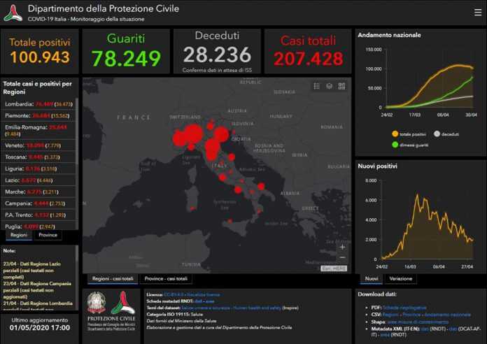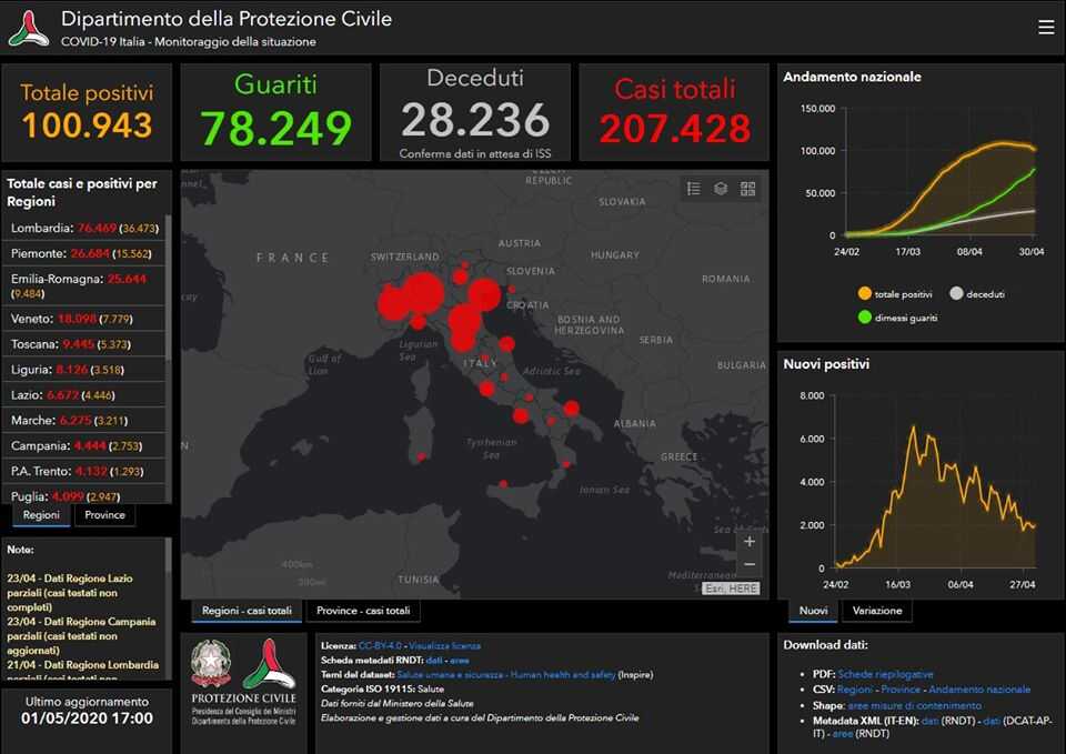 Il totale delle persone che hanno contratto il virus è 207.428, con un incremento rispetto a ieri di 1.965 nuovi casi. Il numero totale di attualmente positivi è di 100.943, con una decrescita di 608 assistiti rispetto a ieri. Tra gli attualmente positivi 1.578 sono in cura presso le terapie intensive, con una decrescita di 116 pazienti rispetto a ieri. 17.569 persone sono ricoverate con sintomi, con un decremento di 580 pazienti rispetto a ieri. 81.796 persone, pari al 81% degli attualmente positivi, sono in isolamento senza sintomi o con sintomi lievi. Il numero complessivo dei dimessi e guariti sale invece a 78.249, con un incremento di 2.304 persone rispetto a ieri.