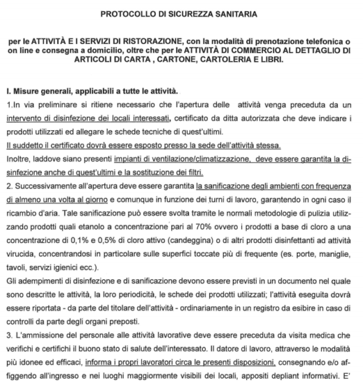 2. E’ fatto obbligo, per gli esercenti e gli operatori impegnati nelle attività di cui al precedente punto 1 e per gli utenti, di osservare le misure di sicurezza e precauzionali prescritte nel protocollo allegato sub A al presente provvedimento per formarne parte integrante e sostanziale.