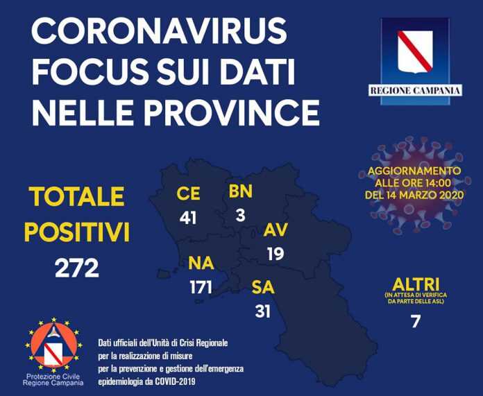 La ripartizione per provincia dei casi fin qui risultati positivi al Covid-19 IN Campania aggiornati alle 14 di oggi.