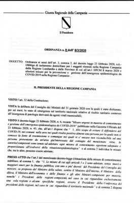Nuova ordinanza firmata dal Governatore De Luca. Quarantena obbligatoria per chi torna dal Nord. L’ordinanza dispone l’obbligo di isolamento domiciliare per le persone rientrate in Campania dalla zona rossa definita nel decreto del Presidente del Consiglio dell’8 marzo 2020. Nell’ordinanza firmata dal presidente della Regione Campania, è disposta «con decorrenza immediata e fino al 3 aprile 2020 la sospensione sul territorio regionale delle seguenti attività: piscine, palestre, centri benessere».Inoltre «è disposta, con riferimento ai centri di riabilitazione per soggetti disabili, la facoltà di differimento delle terapie, su richiesta del tutore o legale rappresentante, senza che ciò comporti decadenza dal diritto alla prestazione»