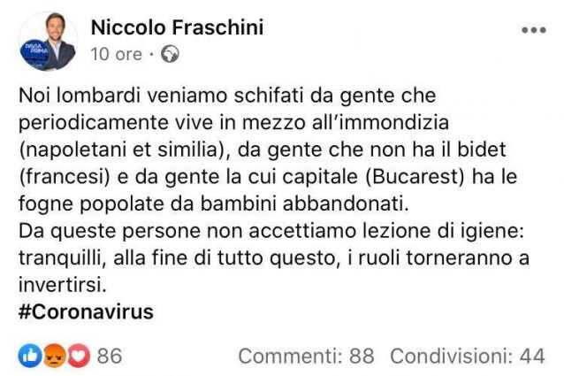 “Noi lombardi veniamo schifati da gente che periodicamente vive in mezzo all’immondizia (napoletani et similia), da gente che non ha il bidet (francesi) e da gente la cui capitale (Bucarest) ha le fogne popolate da bambini abbandonati”. Ne ha per tutti Niccolò Fraschini, consigliere comunale a Pavia per la lista di centrodestra “Pavia prima” a sostegno del sindaco Mario Fabrizio Fracassi e addetto stampa al Consiglio regionale della Lombardia. L’esponente politico ha pubblicato un post razzista sulla propria pagina Facebook, prendendosela senza mezzi termini contro napoletani, francesi e romeni per presunti episodi di discriminazione ai danni dei lombardi a causa dell’epidemia di Coronavirus in atto.