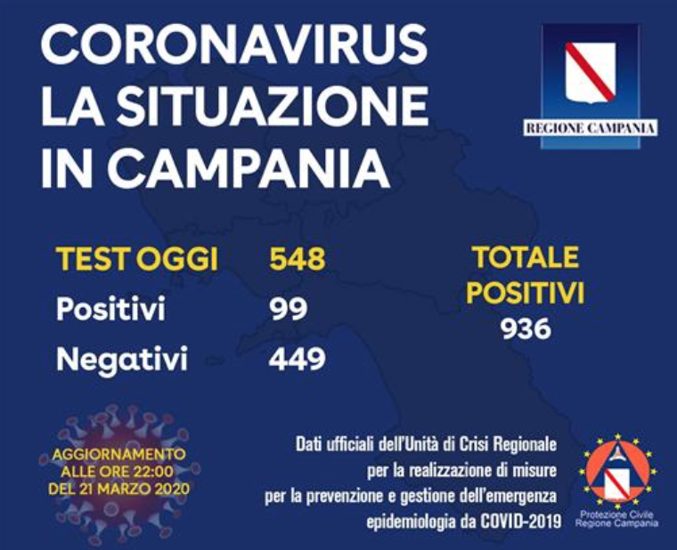 Nel dettaglio l’Unita’ di Crisi della Regione Campania comunica che, dal pomeriggio, sono stati analizzati: – presso il centro di riferimento della Federico II 11 tamponi di cui 3 risultati positivi; – presso il centro di riferimento dell’ospedale Moscati 80 tamponi di cui 12 risultati positivi; – presso il centro di riferimento dell’ospedale Cotugno 107 tamponi di cui 15 risultati positivi; – presso il centro di riferimento dell’ospedale Ruggi 40 tamponi di cui 5 risultati positivi; – presso il centro di riferimento dell’ospedale Sant’Anna 37 tamponi di cui 9 risultati positivi; – presso il centro di riferimento dell’ospedale San Paolo 17 tamponi di cui 1 risultato positivo. Pertanto i positivi di queste sessioni del pomeriggio-sera sono 45; positivi di oggi: 99 (92 + 7 arrivati in nottata dall’ospedale Sant’Anna ma conteggiati oggi); tamponi di oggi: 548; totale complessivo positivi Campania: 936.