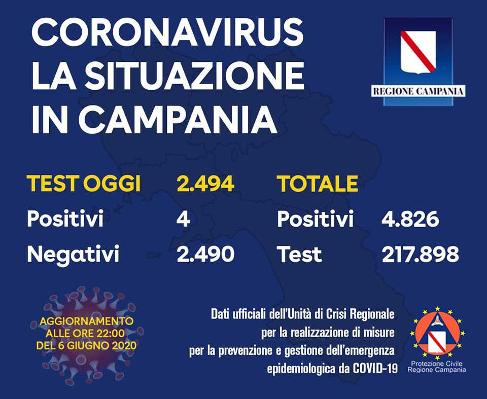 L’Unità di Crisi della Regione Campania comunica che nella giornata odierna sono stati esaminati complessivamente 2.494 tamponi di cui 4 risultati positivi.