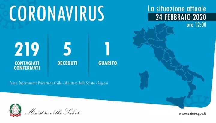 I dati aggiornati alle ore 12 su fonte Dipartimento Protezione Civile – Ministero della Salute – Regioni: 219 contagiati confermati, 5 deceduti, 1 guarito