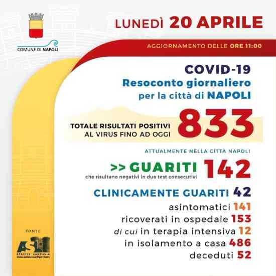 Così come registrato dall’Asl Napoli 1 Centro i positivi al coronavirus a Napoli restano 833. Si registrano altri 11 guariti.