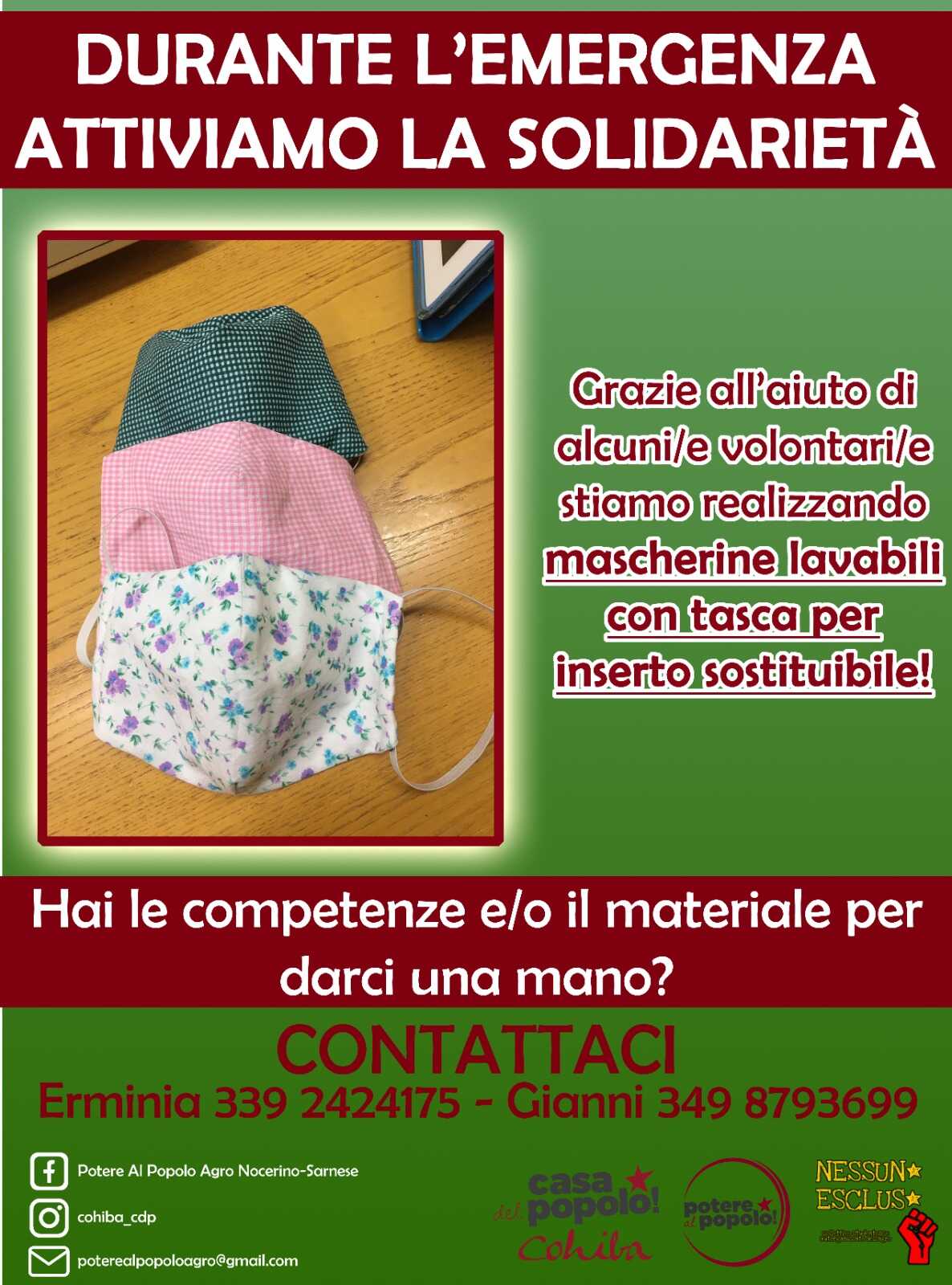 PER QUESTO MOTIVO RIVOLGIAMO A TUTTI/E UN APPELLO e vi invitiamo a contattare la Casa del Popolo Cohiba se avete una macchina da cucire e volete contribuire a confezionare mascherine, oppure se avete stoffe 100% cotone, elastici piatti o cordini da donare.