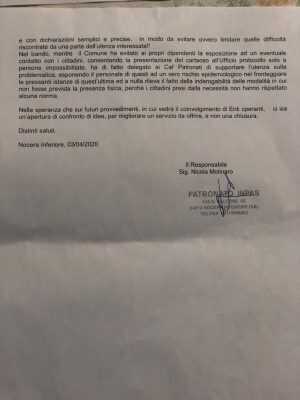 Il modulo predisposto per i buoni spesa  è decisamente complesso. E’richiesto, in difformità dal modulo standard dell’Anci, l’iban di tutta la famiglia, sono richieste varie utenze con relativi importi, ultime mensilità riscosse e altre informazioni. Sul modulo, inoltre, hanno sbagliato ad indicare la email della posta certificata, mancando una lettera . Parecchie persone soprattutto anziane non hanno email. Tanti non hanno scanner per inviare i documenti. Il Protocollo è aperto solo per casi particolari, il resto è demandato a caf e patronati. A nostro modo di vedere, il modulo per la domanda doveva essere semplificato, come è accaduto in altri comuni ed accettare anche diverse da modalità di invio documenti. In allegato, la lettera inviata al Comune tramite pec.